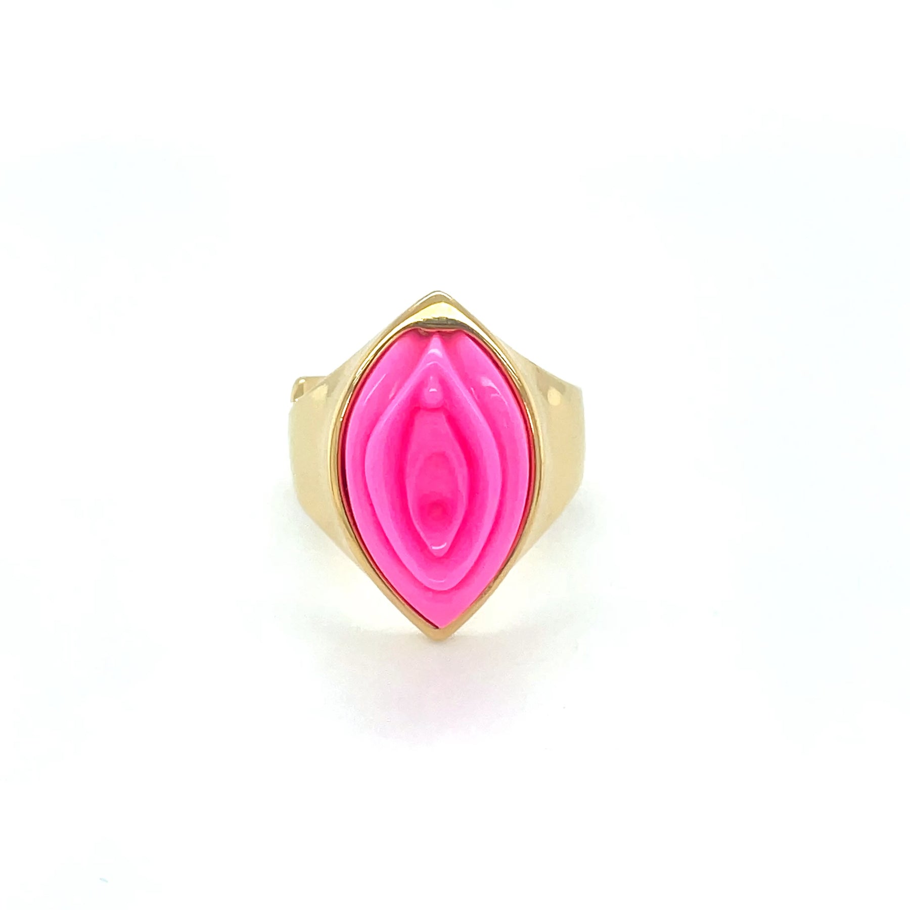Ring aus goldplattiertem Messing (auf Anfrage auch in rhodiniert verfügbar) mit Vulva aus Epoxidharz gegossen.