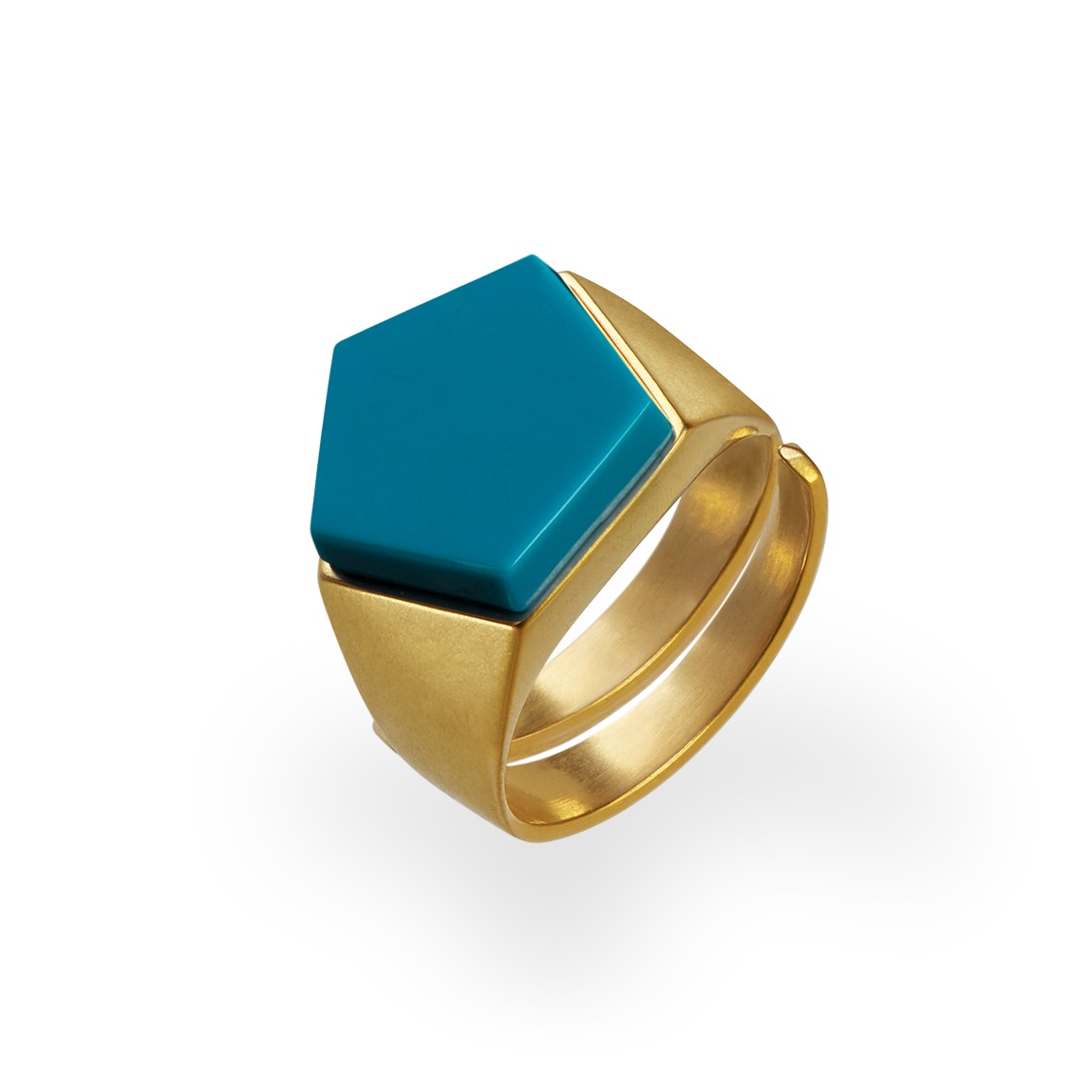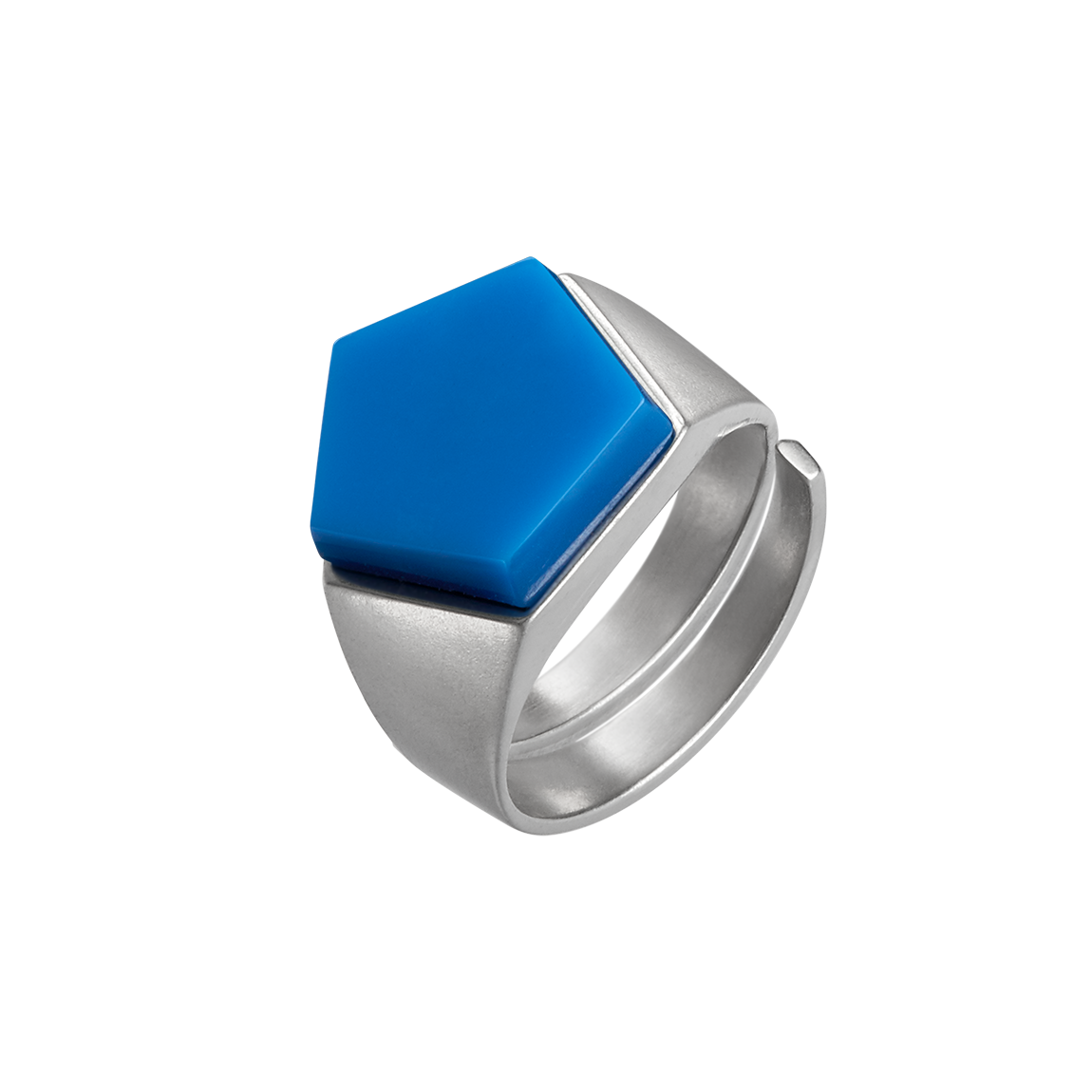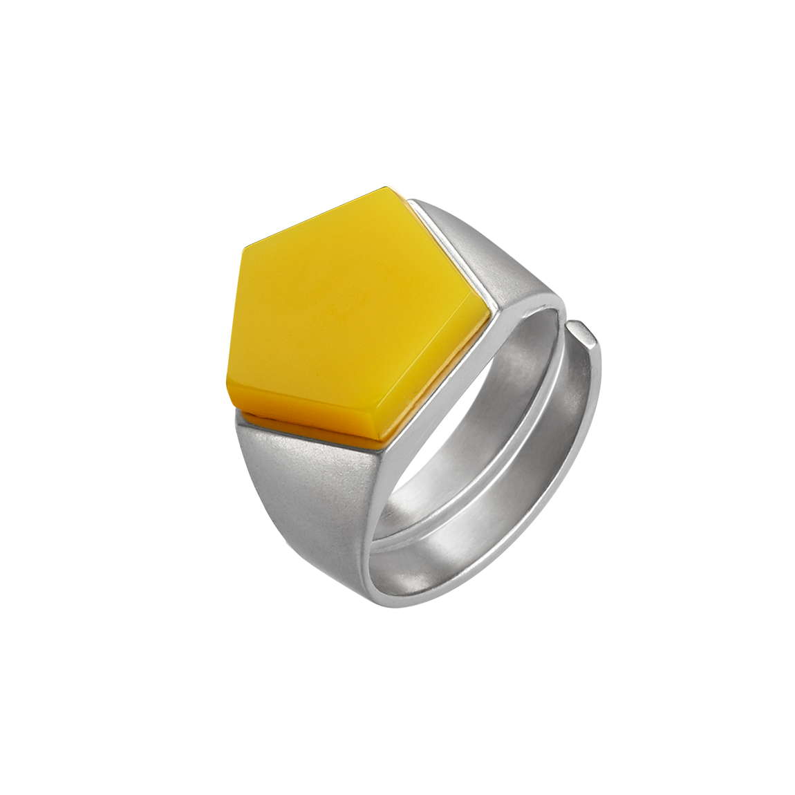 Brushed to a satin finish, the pentagon-based shape rotates through the entire pentagon ring. Rhodium-plated or gold-plated, this minimalist design nestles snugly on the finger. The duroplast stone manufactured in our laboratory can be selected in 8 different colours. It not only invites you to collect this architecturally breathtaking piece of jewellery, no, based on the color theory of the Bauhaus artist Johannes Itten, this ring is a direct connection to the color spectrum of our universe.