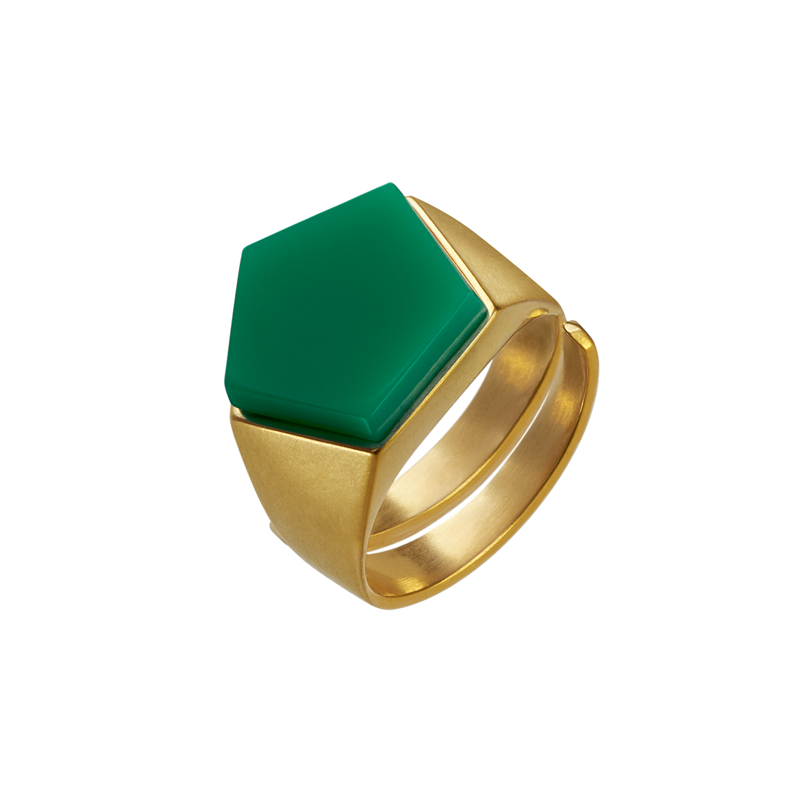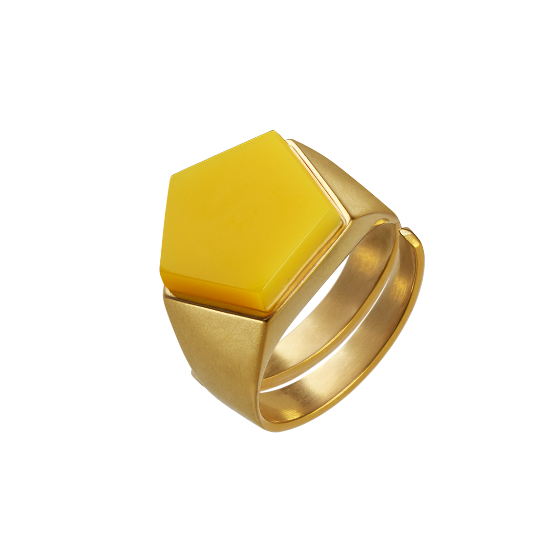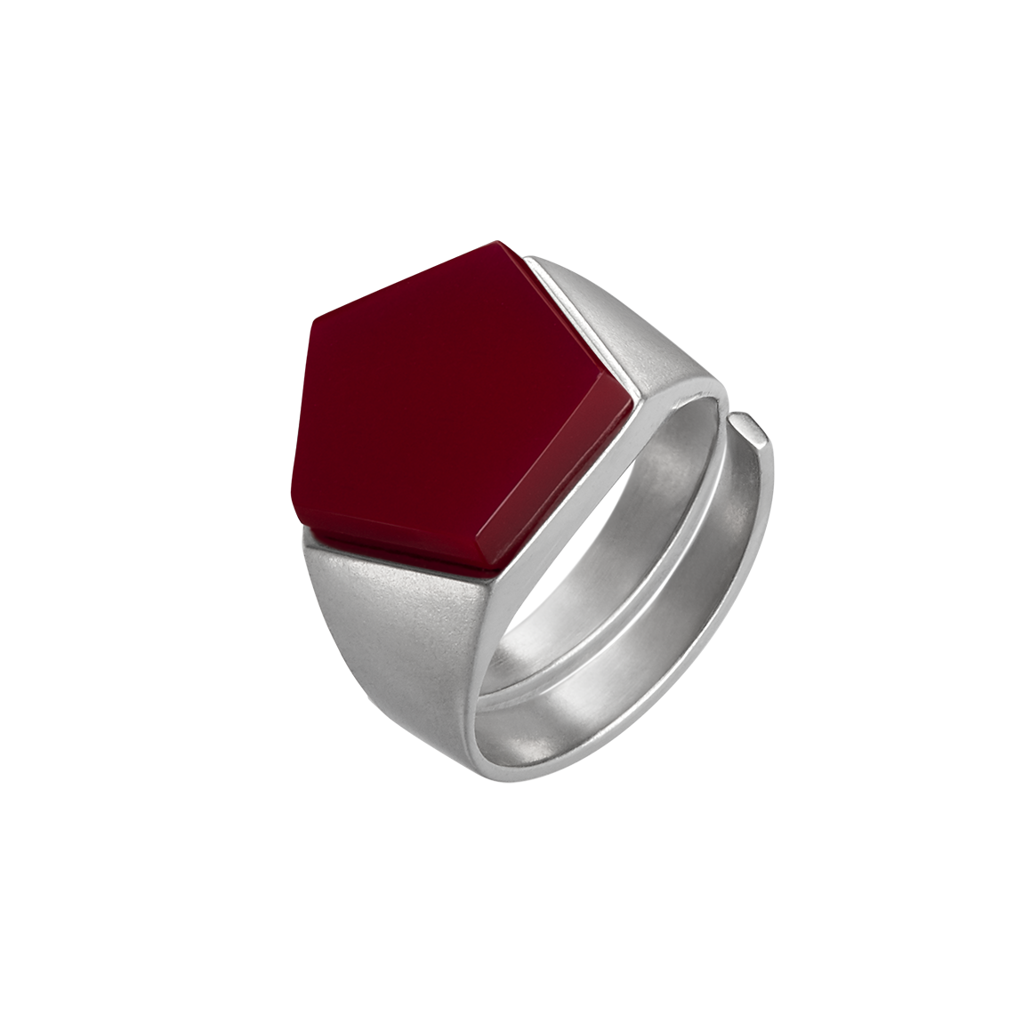 Brushed to a satin finish, the pentagon-based shape rotates through the entire pentagon ring. Rhodium-plated or gold-plated, this minimalist design nestles snugly on the finger. The duroplast stone manufactured in our laboratory can be selected in 8 different colours. It not only invites you to collect this architecturally breathtaking piece of jewellery, no, based on the color theory of the Bauhaus artist Johannes Itten, this ring is a direct connection to the color spectrum of our universe.